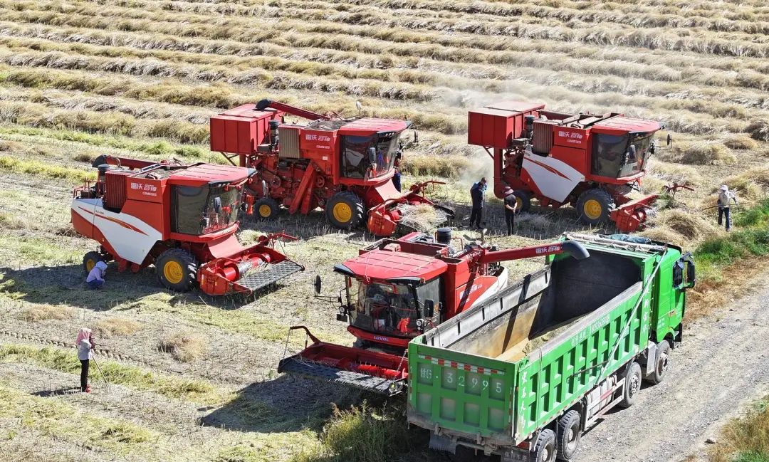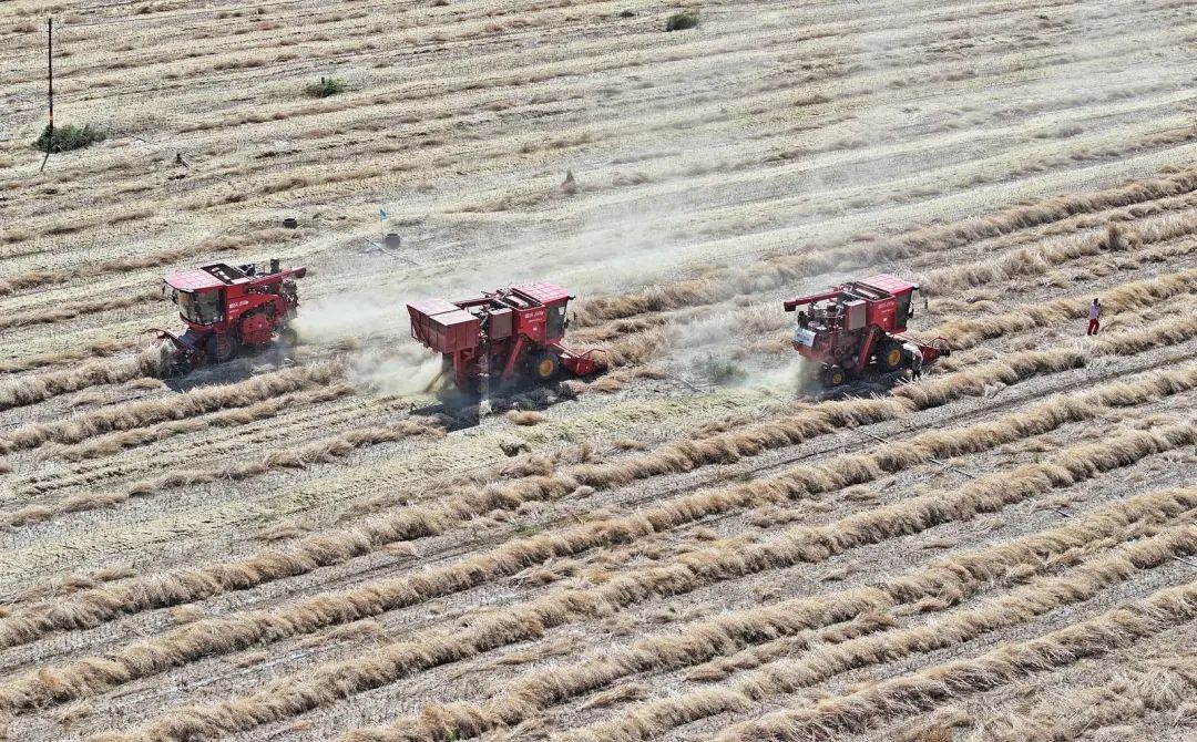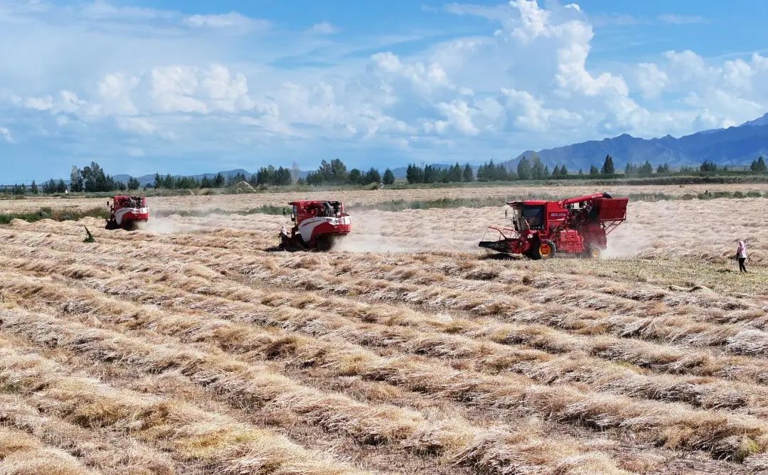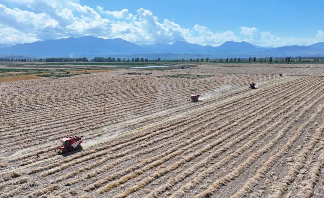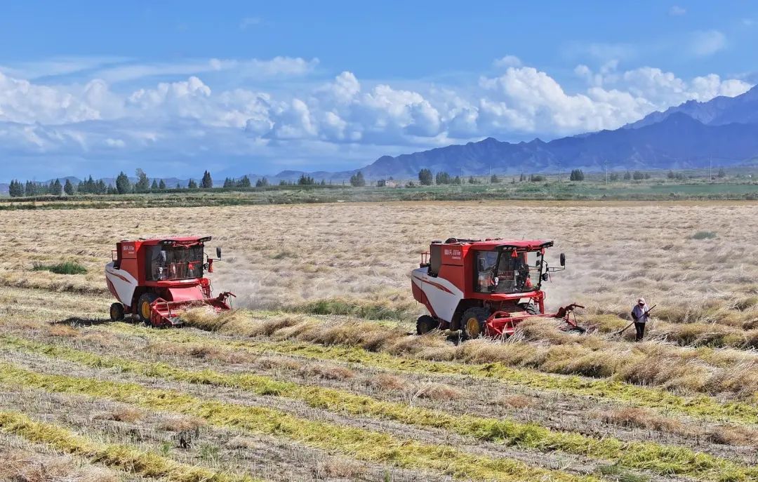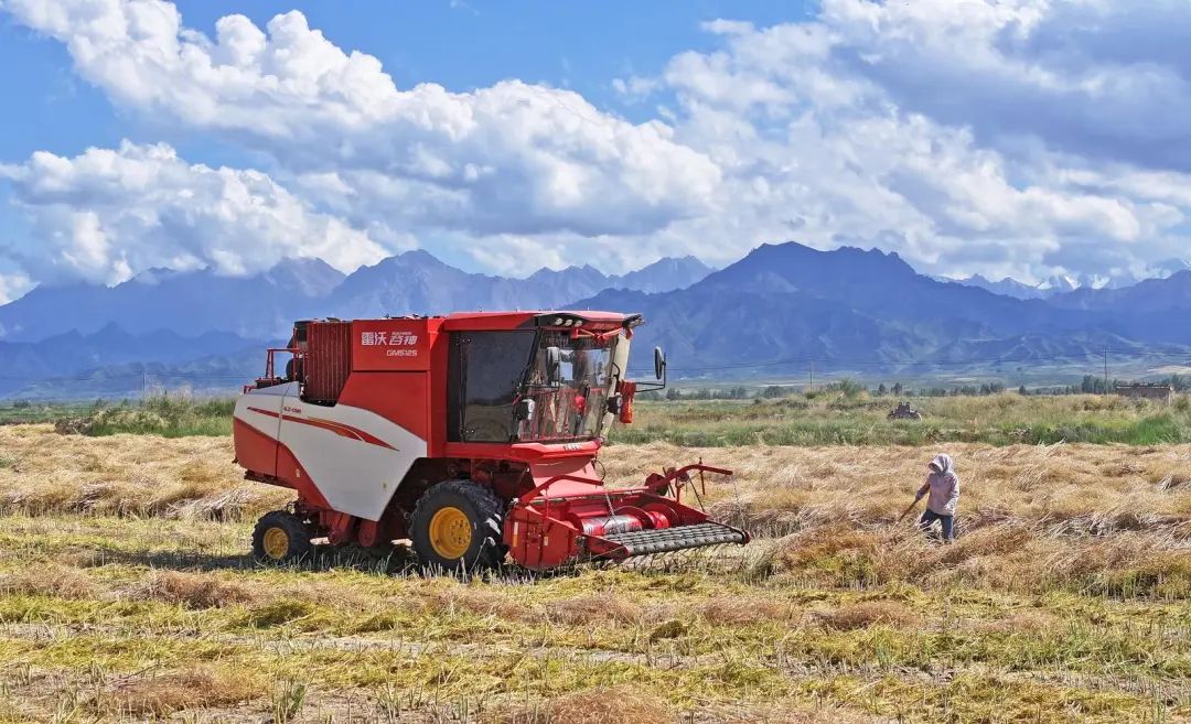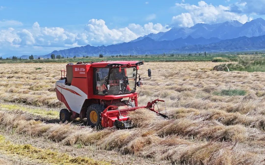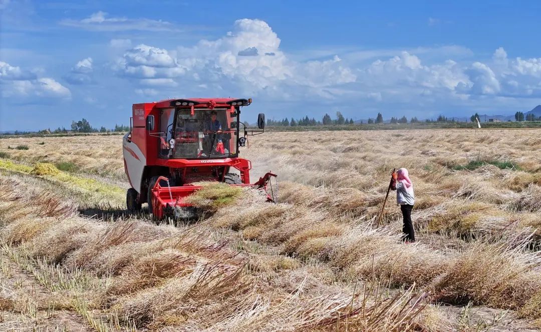 2025年8月24日,在甘肃省张掖市民乐县新天镇韩营村千亩油菜种植基地,村民驾驶农机在田间开展油菜籽抢收作业。