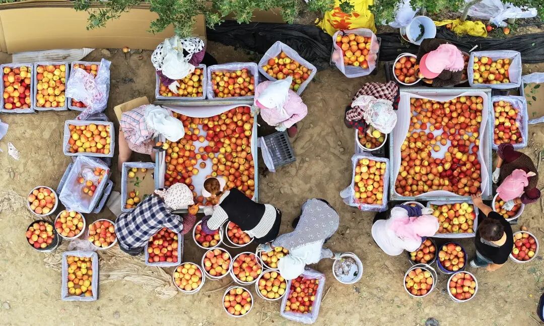 2025年9月3日,在甘肃省张掖市民乐县六坝镇嘎啦苹果种植基地,果农们正忙着采摘、挑选和储运嘎啦苹果。