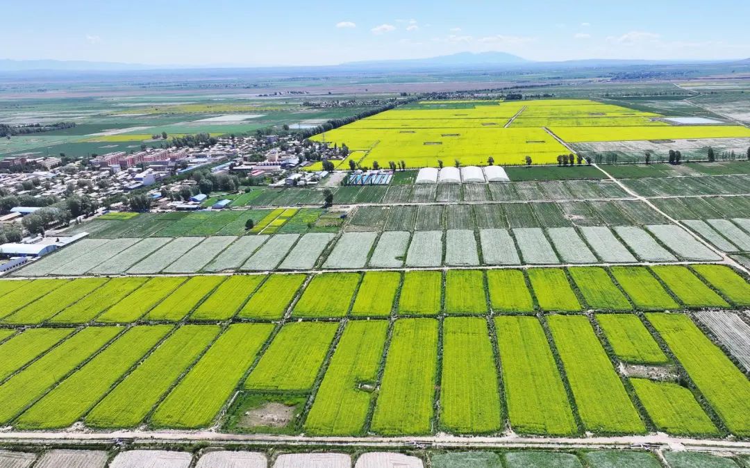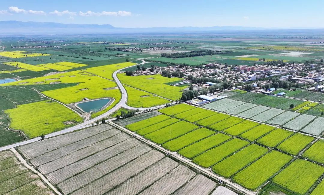 2025年6月27日,甘肃省张掖市民乐县新天镇韩营村油菜花进入盛花期,金黄花海与乡村、青山、绿树、公路等相映成趣,构成一幅色彩斑斓的田园画卷。