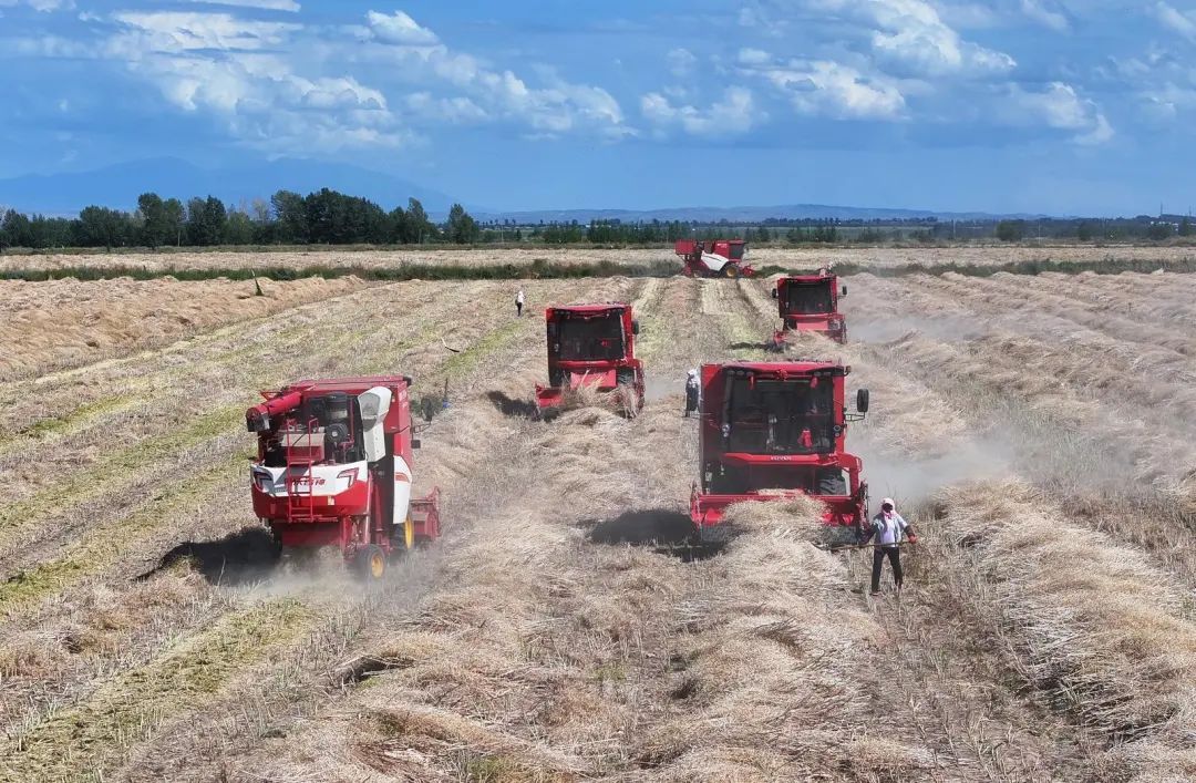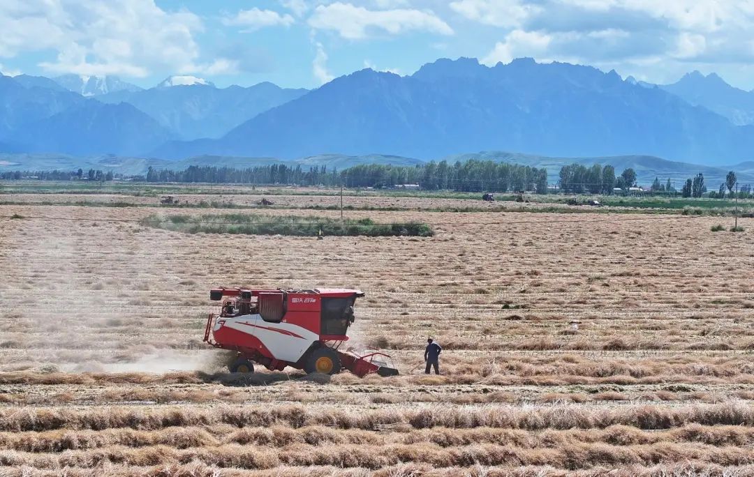 2025年8月24日,在甘肃省张掖市民乐县新天镇韩营村千亩油菜种植基地,村民驾驶农机在田间开展油菜籽抢收作业。