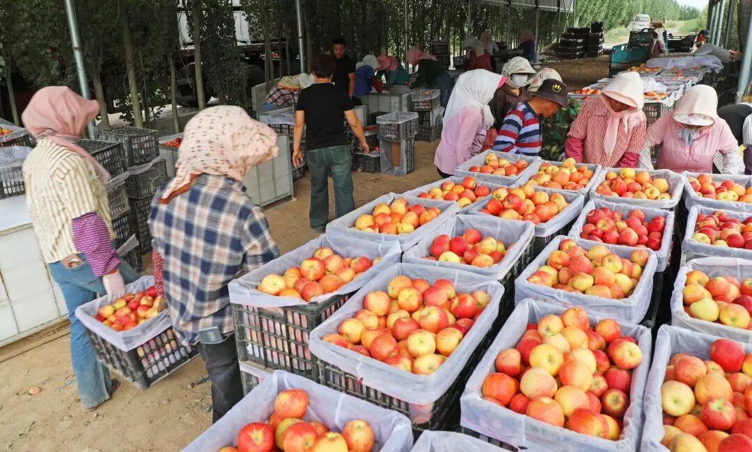 2025年9月3日,在甘肃省张掖市民乐县六坝镇嘎啦苹果种植基地,果农们正忙着采摘、挑选和储运嘎啦苹果。